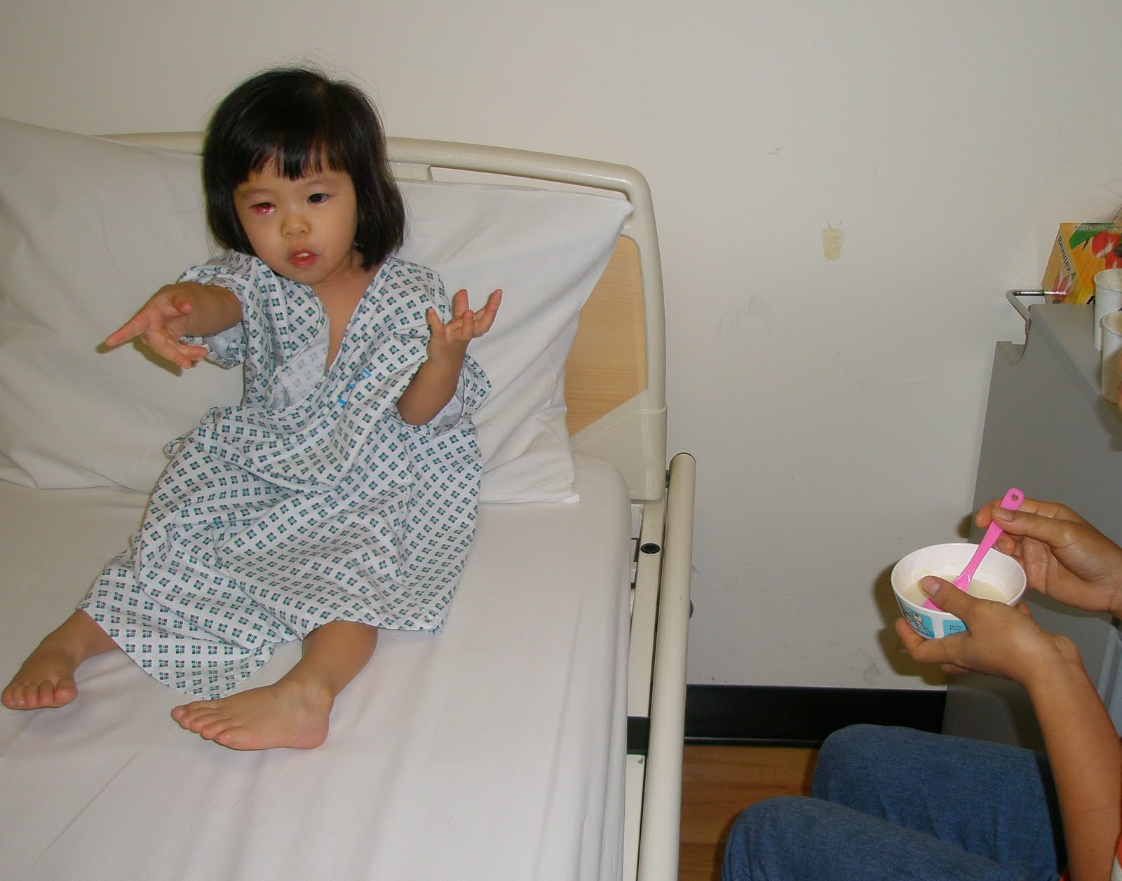 This is Baby about 2 hours post surgery yesterday. In this picture, she was pointing to daddy’s Big Mac bun. On normal days, she would push the rather bland sesame bun away but yesterday, she was really famished! She just stuffed the bun into her mouth and with the bun still in her mouth, she was asking for more. However, she did not appear thirsty though. I had expected her to chug down a gallon of water when she could finally drink but I was wrong. She only wanted my milkie. My helper and I had to force her drink lots of fluids. I was also worried that the lack of fluids in her body will pave way for the pesky bacteria to wreck havoc in her urinary system again. Sigh…. this child of mine has so many health issues!