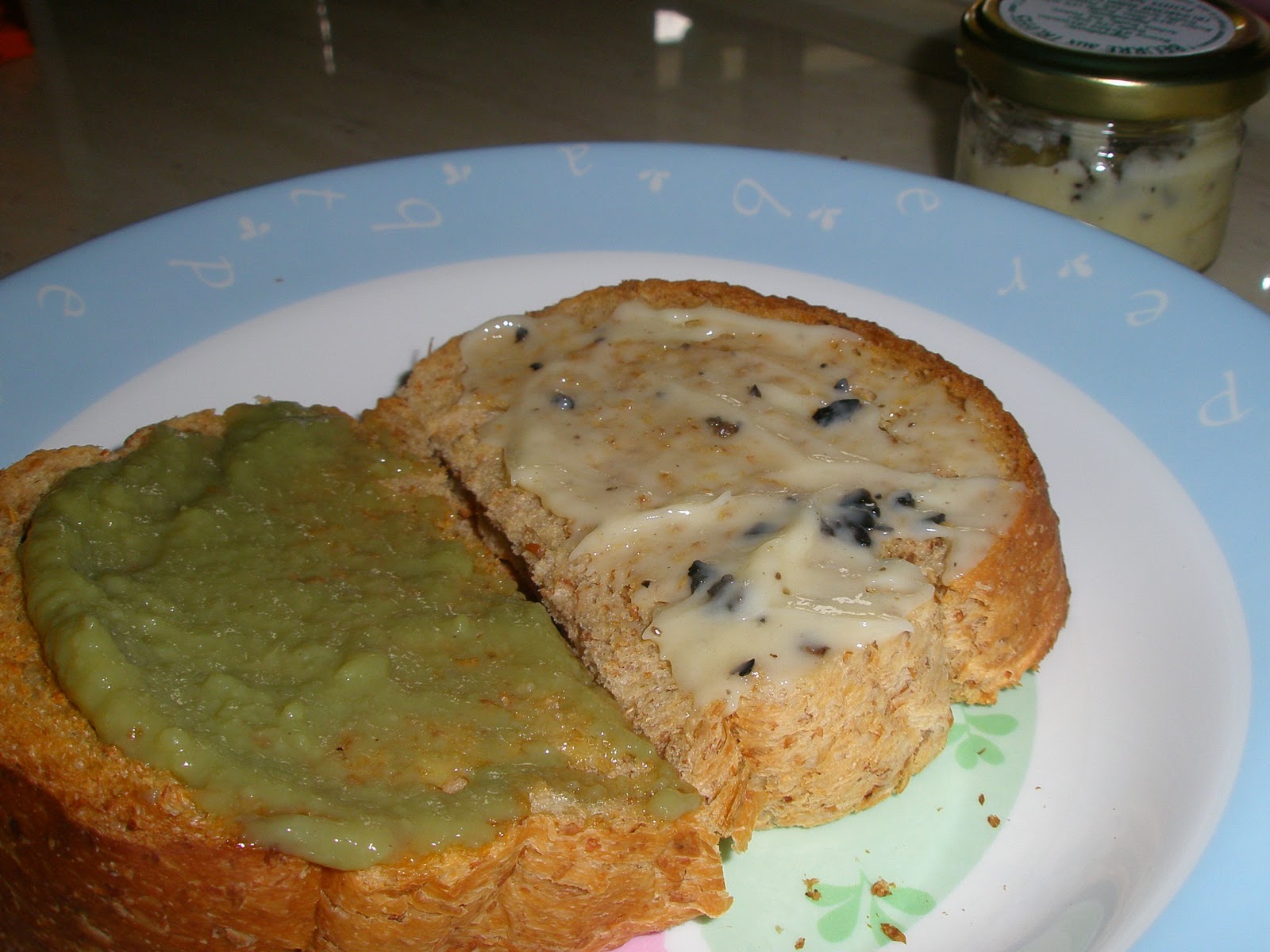 My breakfast – a slice of wholemeal walnut bread. Half a slice with kaya and half a slice with truffle butter.