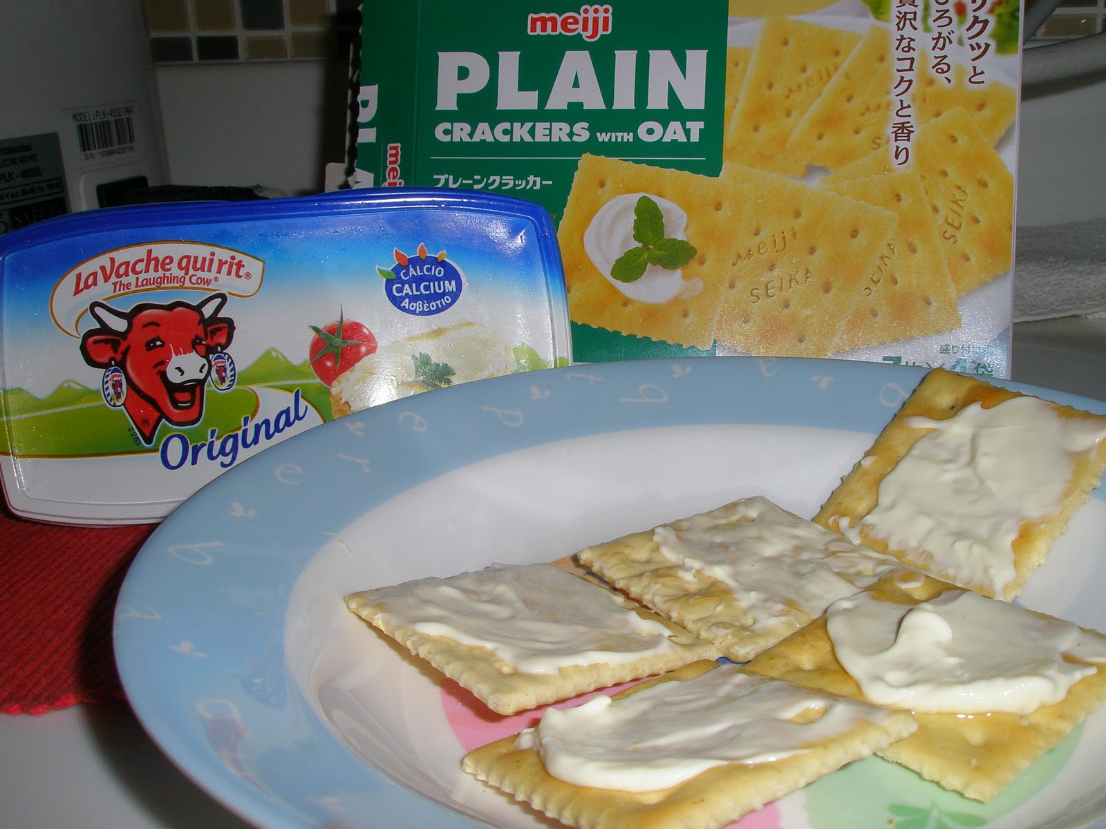 Laughing Cow cheese spread on a packet of Meiji plain crackers with oats…