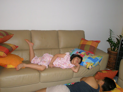 On the night Alycia returned from her vacation in Hong Kong 2 days ago, she gave us all a scare. When she got home from the airport, she appeared very frazzled and her cheeks were very rosy. After her dinner, she told us that she was very sleepy and so she went to bed at around 9ish pm, which was very early for her. At around 1:30am, she got up from bed and cried… which was a very rare incident. She hardly cries these days. First she said that her hand was very painful. There wasn’t any swell or any scar on her hand so daddy massaged her hand with his Perskindol deep heat cream for pains in the muscles and joints. After crying for about an hour, she told daddy that her leg hurt. First pain in the hand, then pain in the leg. Worried, daddy wanted to bring her to the hospital. I told him that it’s not necessary as the doctor would probably just give her some painkillers and tell us to observe her. I know those MOs in the ER too well! I told daddy that we should just wait and see what happens the next morning. After telling us that her hand and leg were achy, Alycia then complaint that her tummy was painful this time, haiz! Minutes later, she said she wanted to eat biscuits! I said no to her request as I didn’t want her to eat sticky and sweet food at 3am. I then fixed her some milk which she finished. After finishing her milk, Alycia requested daddy to play cards with her, which dadddy did at 3:30am! After playing cards, it was already 4am and daddy could not open his eyes any further. He told Alycia to lie down on the couch in the living room and turned on the TV for her to watch Disney channel, whilst he slept on the floor to accompany her. Alycia watched TV for about 2 hours before dozing off on the couch like this: