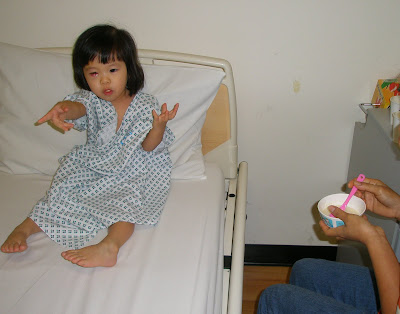 This is Baby about 2 hours post surgery yesterday. In this picture, she was pointing to daddy’s Big Mac bun. On normal days, she would push the rather bland sesame bun away but yesterday, she was really famished! She just stuffed the bun into her mouth and with the bun still in her mouth, she was asking for more. However, she did not appear thirsty though. I had expected her to chug down a gallon of water when she could finally drink but I was wrong. She only wanted my milkie. My helper and I had to force her drink lots of fluids. I was also worried that the lack of fluids in her body will pave way for the pesky bacteria to wreck havoc in her urinary system again. Sigh…. this child of mine has so many health issues!