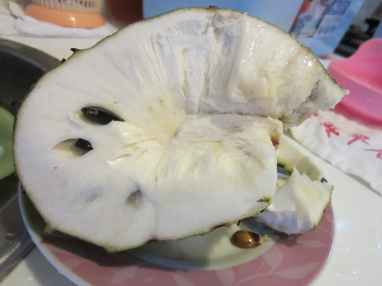 The other morning, I bought a soursop from my regular supplier of veggie and meat as I could not remember ever eating it before and I wanted to try after hearing and reading so much about the goodness of soursop. The seller told me that the soursop was still very raw and recommended to me to have it boiled as soup with some pork ribs. So I bought a medium size soursop which cost over RM6. After leaving the soursop in my kitchen in room temperature for about 2 weeks, I got impatient and decided to cut up the fruit, though the fruit did not feel completely soft. After it was cut up, the inside was still hard. And it did not taste pleasant. It tasted like a cross between a tasteless raw pineapple and ‘fun kok’ (a root used to boil soup). That’s the price to pay for being impatient. I should have waited for another week for the entire fruit to ripen. I was told that a ripe soursop is very sweet and the flesh is creamy and soft. I forced myself to eat a quarter of this tasteless, hard fruit while telling myself that this stuff is chokefull of health benefits. My mum suggested that I cooked veggie curry with this fruit but I had left it in the fridge and had forgotten all about it until a week later. It ended up in the bin, sigh. The next time I buy a soursop, I’ll make sure I choose a completely ripe one to enjoy it.
