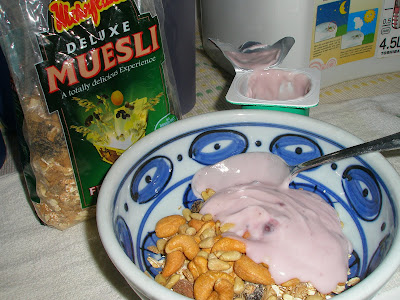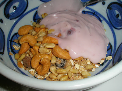 Anlene strawberry yoghurt with pine nuts, cashew nuts and almonds.