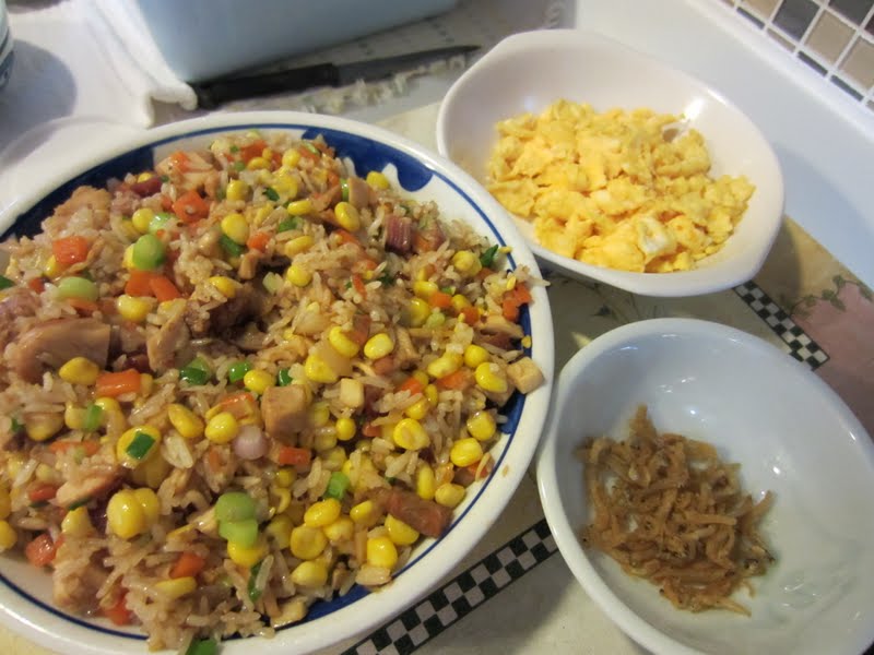 Fried rice is one of the easiest and tastiest meals to whip up in a jiffy. Plus I can dump all the left over overnight food to fry with the rice. My fried rice normally consists of chicken breast meat from the roast chicken (siu kai fan) that we take away for lunch (no one touches chicken breast meat but when they are all chopped up and fried with rice, every bit of the meat will be polished off!), sweet corn kernels (from left over sweet corn on cob that we buy from the night market), diced carrots (add sweetness to the fried rice), chopped sawi, eggs and sometimes I will fry some crispy anchovies as topping. Oh not forgetting some chopped spring onions. We all love spring onions and I will sprinkle loads of them into our dishes. They are nutritious and add flavor to the food.